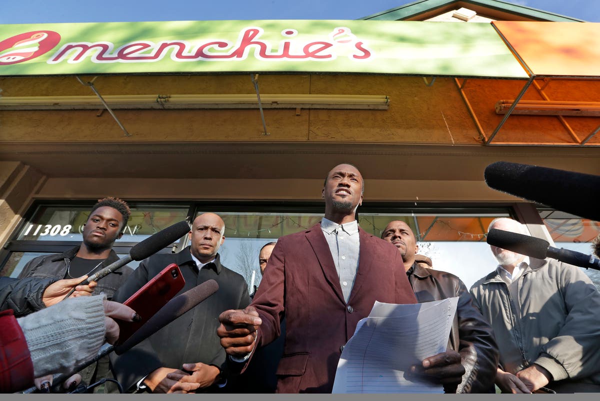 Caption: Byron Ragland addresses reporters on Nov. 20 in Kirkland. The police department there has apologized for an incident in which officers helped the owner of the Menchie's shop expel Ragland because employees said they felt uncomfortable. Ragland, who works as a court-appointed special advocate, was in the shop supervising a court-sanctioned outing between a mother and her son.