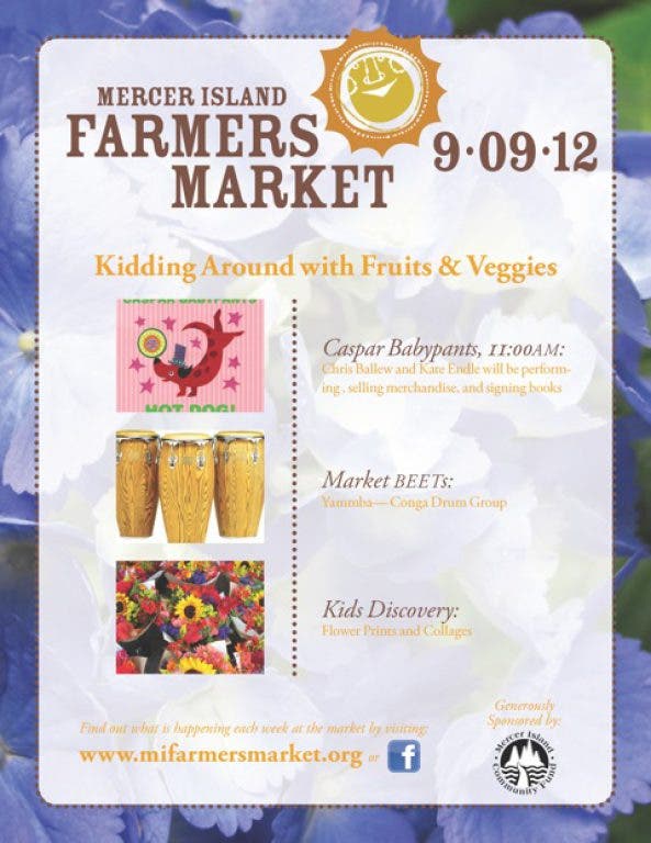 Caspar Babypants' performance this Sunday begins at 11 a.m. The Mercer Island Farmers Market is located at 77th Avenue SE & SE 32nd Street. See you there.