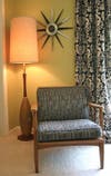 Today, they are fresh and new after being re-upholstered with fabrics I love. The two chairs will live in the living room, cozied up opposite Taylor when he arrives. I envision Taylor against the back wall (until we get my fantasy wall unit, of course) with the gorgeous ladies opposite him. (The ladies need names. Suggestions? UPDATE: The marvelous Michelle suggested Betty and Joan. Perfect!) The fabric I chose for the wood chairs is a warm neutral with green, orange and a wee bit of red woven in. It pulls in the green from the entry wall (Yolo Leaf 04), the orange from the dining room (Yolo Petal 01) and the hallway buff color (Yolo Air 04) perfectly. (Read about Yolo here.) The chairs still need a bit of sanding and refinishing on the wood, but they are still in pretty good shape and really, one thing at a time, people.
