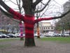 After doing some research when we got back home I discovered that this 'knit graffiti' is , which is the activity of covering things in public places (trees, statues, etc.) with knitted material. These trees were knit bombed by local fiber artist Suzanne Tidwell. Check out the pics I found of other yarn bombed items like a lampost and subway seat.