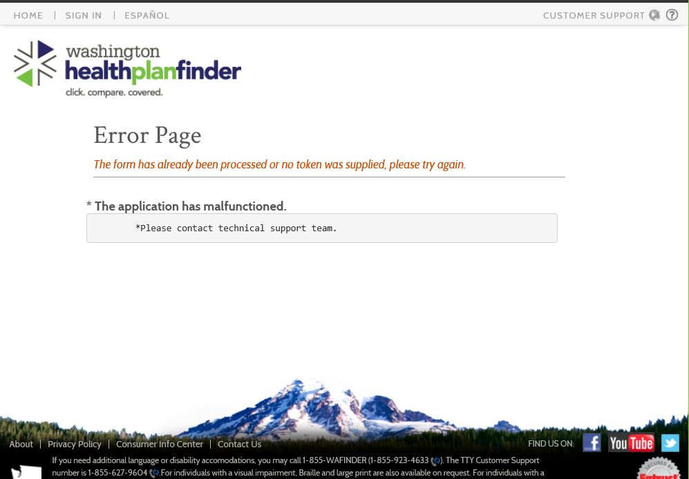 Still working out the website bugs this morning, it appears...image attached. For general interest, suggest attach as many different website error images as we can collect to this posting and we can send them along to their website for troubleshooting, and enjoy the mysteries of newly released software... http://www.wahealthplanfinder.org/