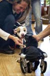 This, however, does not stop him or slow him down. He moves quite freely and quickly by pulling himself along with his front legs and kicking with his hind legs. We have outfitted him with a temporary wheelchair, which will hopefully help him gain muscle tone and mass in his hind legs. One of his hind legs is contracted, so does require stretching a few times a day to help give the muscle more elasticity. In addition, hydrotherapy will need to be utiltized with either a kid-sized pool or even holding him in the tub while he kicks.