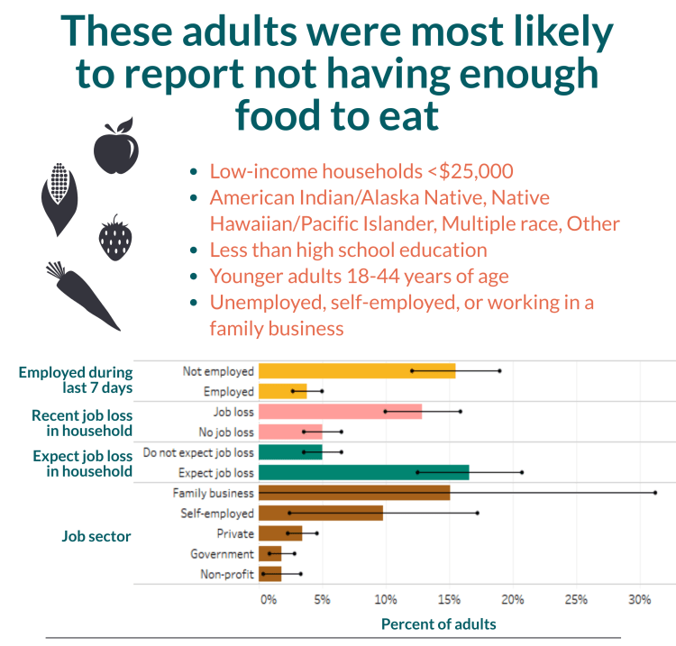 Public Health - Seattle & King County found food security almost doubled after strict COVID-19 containment strategies were implemented. By June, approximately 9 percent of adults surveyed in King, Pierce and Snohomish counties said their homes did not have enough food for the week. Approximately half of those households said they couldn't afford to purchase more food, and many reported job losses or expected job losses related to the pandemic response.