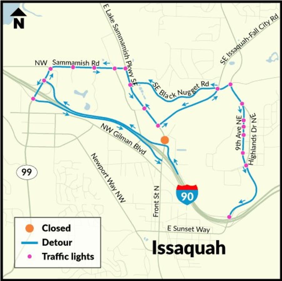 - Crews will close East Lake Sammamish Parkway to both directions of traffic north of the I-90 on- and off-ramps to Front Street from 8:30 p.m. Tuesday, June 13, until 5 a.m. Monday, June 19.