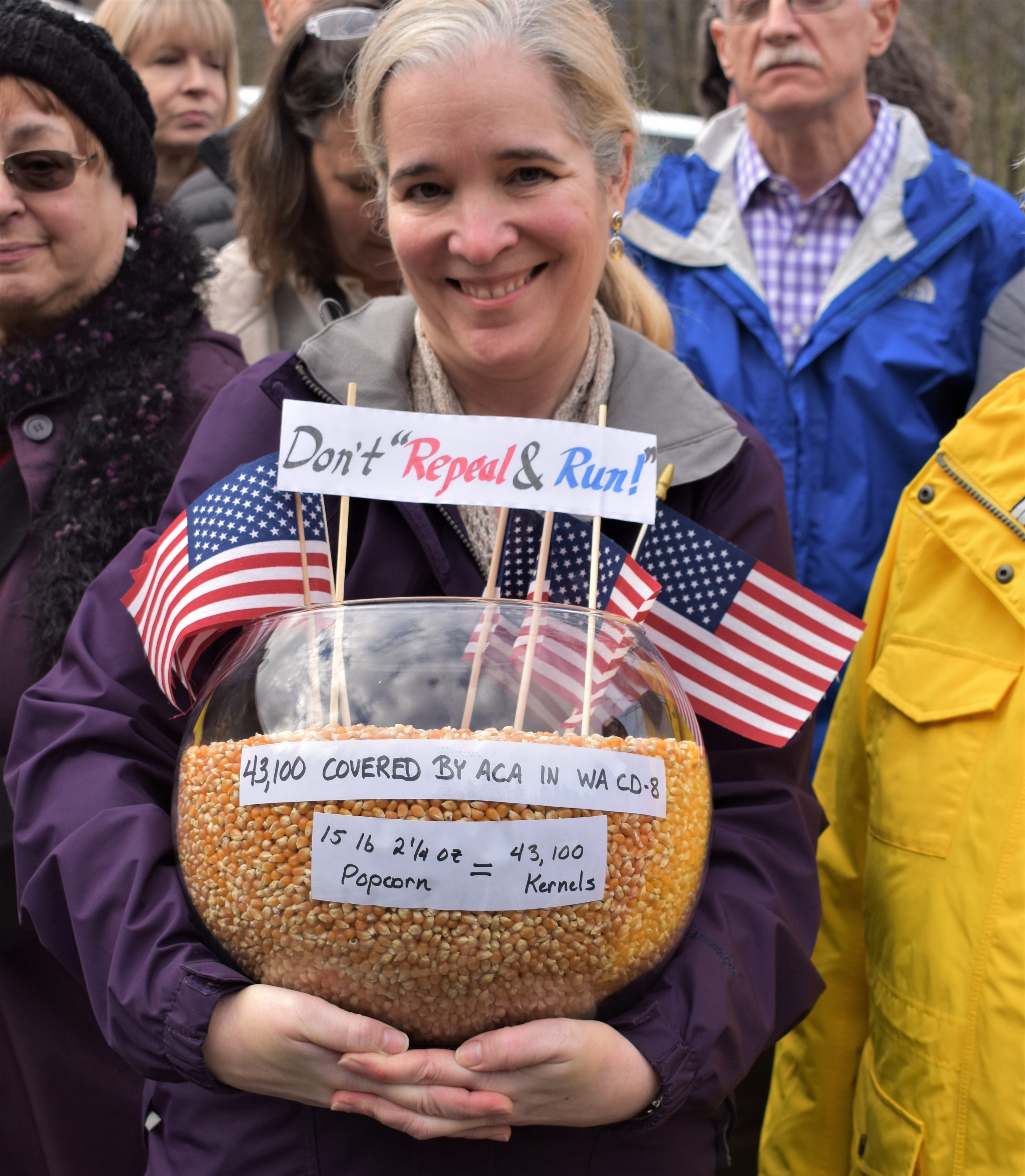 The protesters took turns knocking on the door and ringing the doorbell, but no one answered. Roseann Popa, of Sammamish, brought a large bowl full of popcorn kernels - 15 pounds, she said - to illustrate how many people could lose healthcare in Reichert's district.