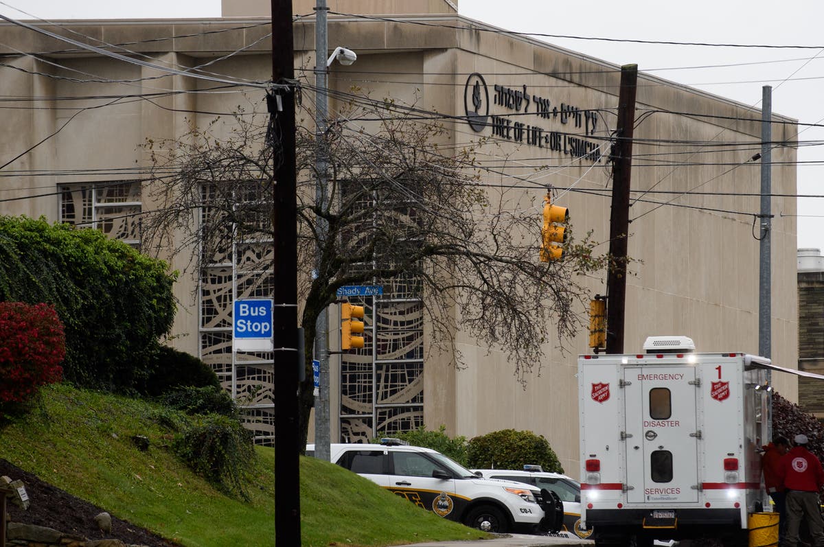 Caption: The scene of a mass hooting at the Tree of Life Synagogue in the Squirrel Hill neighborhood on Oct. 27, 2018 in Pittsburgh, Penn.