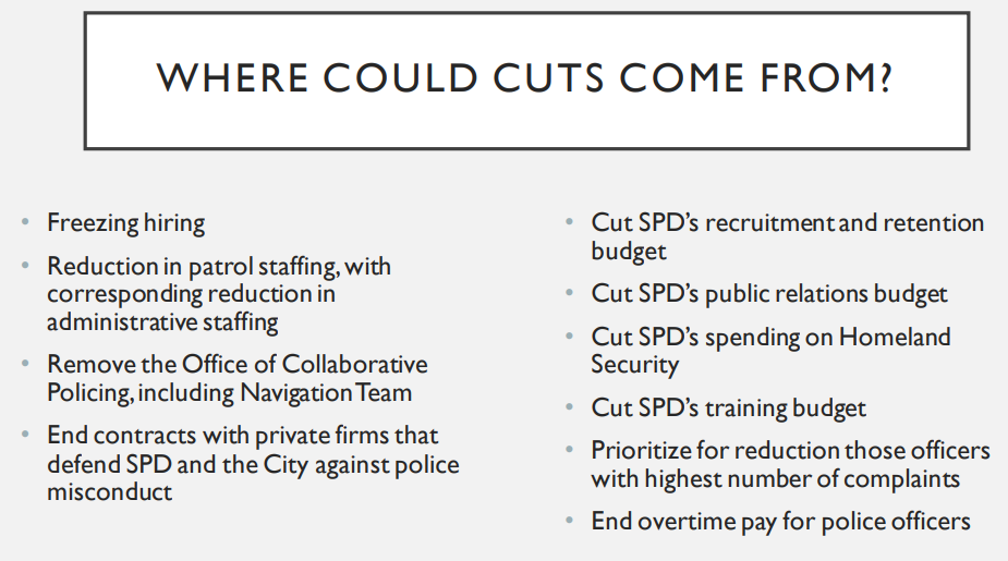 The presentation identifies several areas to reduce the police department's $409 million budget, including an end to overtime pay, cuts to recruitment and public relations budgets and a reduction in patrol staff, beginning with officers who have earned the highest number of misconduct complaints.