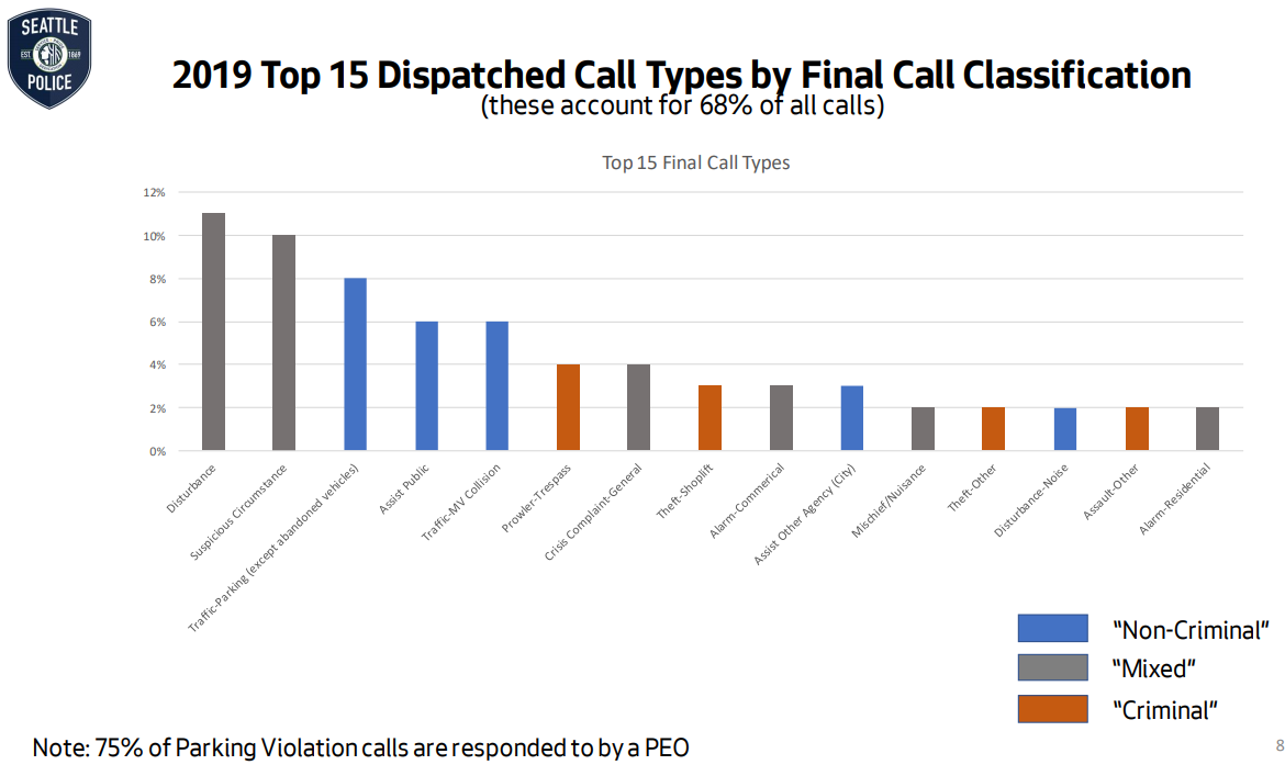 Presenters and city councilmembers referenced a recent New York Times article that reported just 1.3 percent of Seattle 911 calls involved violent crimes.