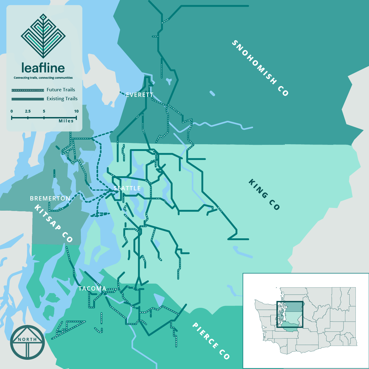 According to the Leafline Trails Coalition, Central Puget Sound is already halfway to that goal, with about 500 miles of existing trails spanning the four counties, including portions of the Eastrail, Cross Kirkland Corridor and Mountains to Sound systems. However, officials said the Leafline vision marks the first "concerted effort" to connect trail systems across jurisdictions.