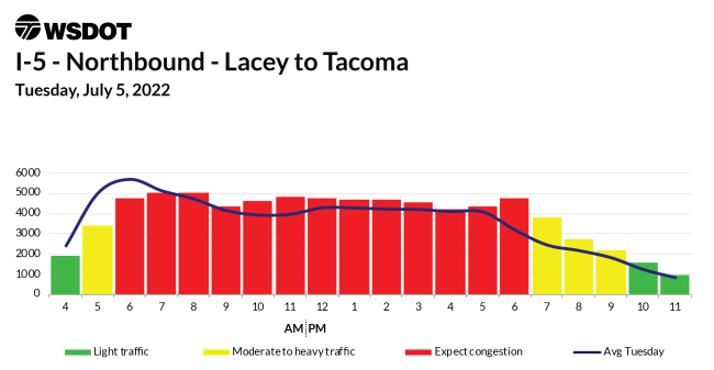 For Interstate 5, WSDOT focuses on the stretch between Lacey and Tacoma, where officials expected heavy northbound traffic would kick up as early as Thursday morning. Similarly, Friday is likely to have several periods of congestion throughout the day, especially between 10 a.m. and 2 p.m., but leveling off around 6 p.m.