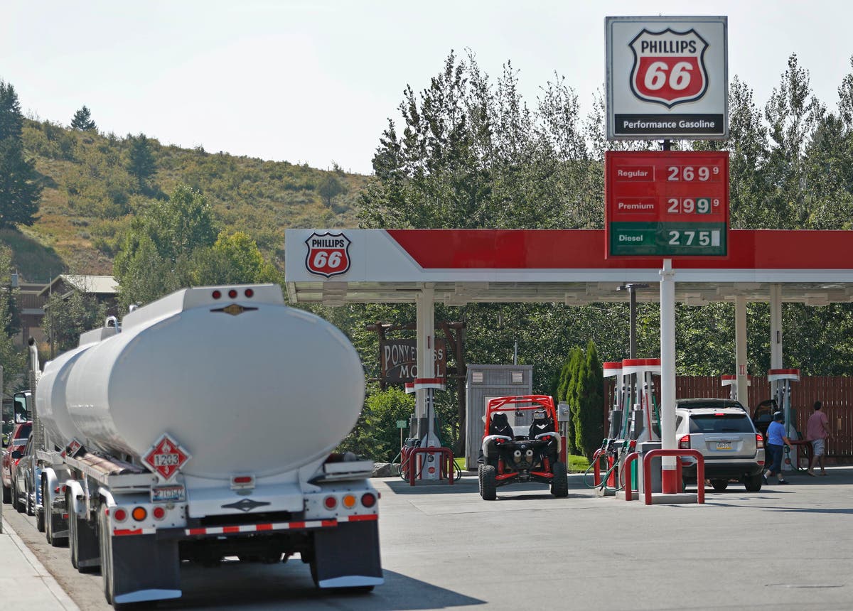 Caption: A gas truck sits on standby at a Phillips 66 gas station in case of any gas shortages on Aug. 20, 2017 in Jackson, Wyoming.