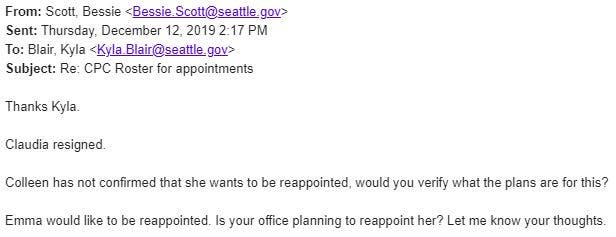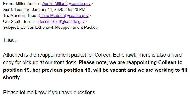 In a Feb. 19 e-mail provided by the mayor's office after the hearing, Michelle Chen, the mayor's legal counsel, argued Durkan's office had made a "special effort" to notify the commission of the seat change in a January e-mail (pictured below). Chen said the mayor's office had not been made aware of any objections among the CPC.