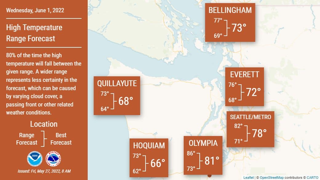 Temperatures Wednesday afternoon should hit at least the mid-70s all around Puget Sound, and may even flirt with the 80s around Seattle and the South Sound. On average, Seattle records its first 80-degree day by May 20. Even if the Emerald City breaks the threshold Wednesday, it will be the latest date in more than a decade, the weather service said.