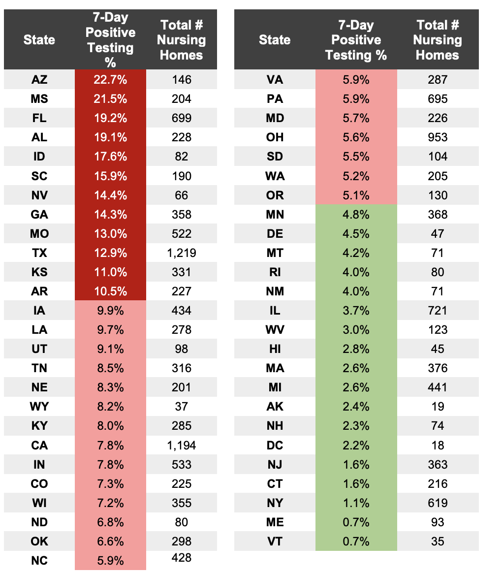 On July 22, the Centers for Medicare and Medicaid Services announced that, "[they] will begin requiring, rather than recommending, that all nursing homes in states with a 5% positivity rate or greater test all nursing home staff each week."