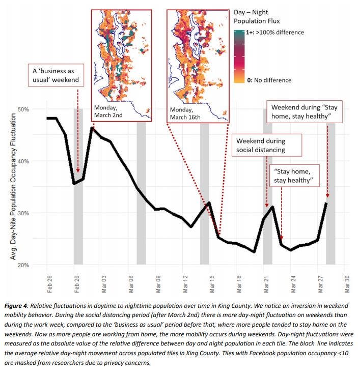 Researchers said the information provided from Facebook was collected from mobile users with location services enabled and does not identify individuals. Using that data, the report compared "mobility patterns" for roughly 230,000 people between Feb. 26 and March 28, finding a nearly 90 percent reduction in overall movement during daytime and nighttime hours by March 28.