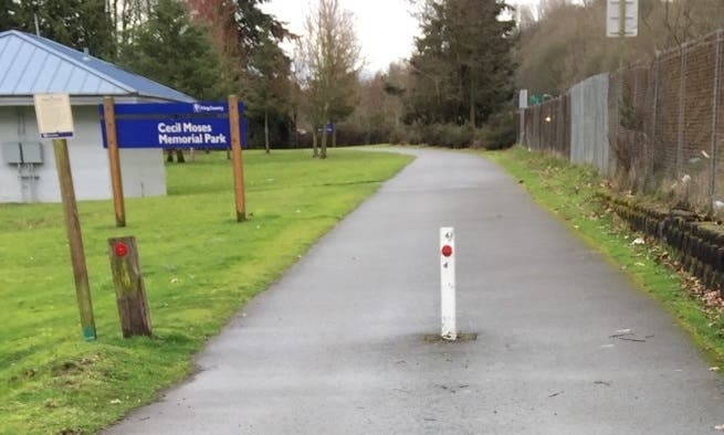 The bollard that Schwartz hit is located near where the Green River Trail enters Cecil Moses from the northwest along 27th Avenue South. The bollard is meant to separate pedestrian and bicycle traffic and is painted white. The lawsuit alleges that King County did not "install warning signs or other barriers" to warn cyclists of the obstacle.