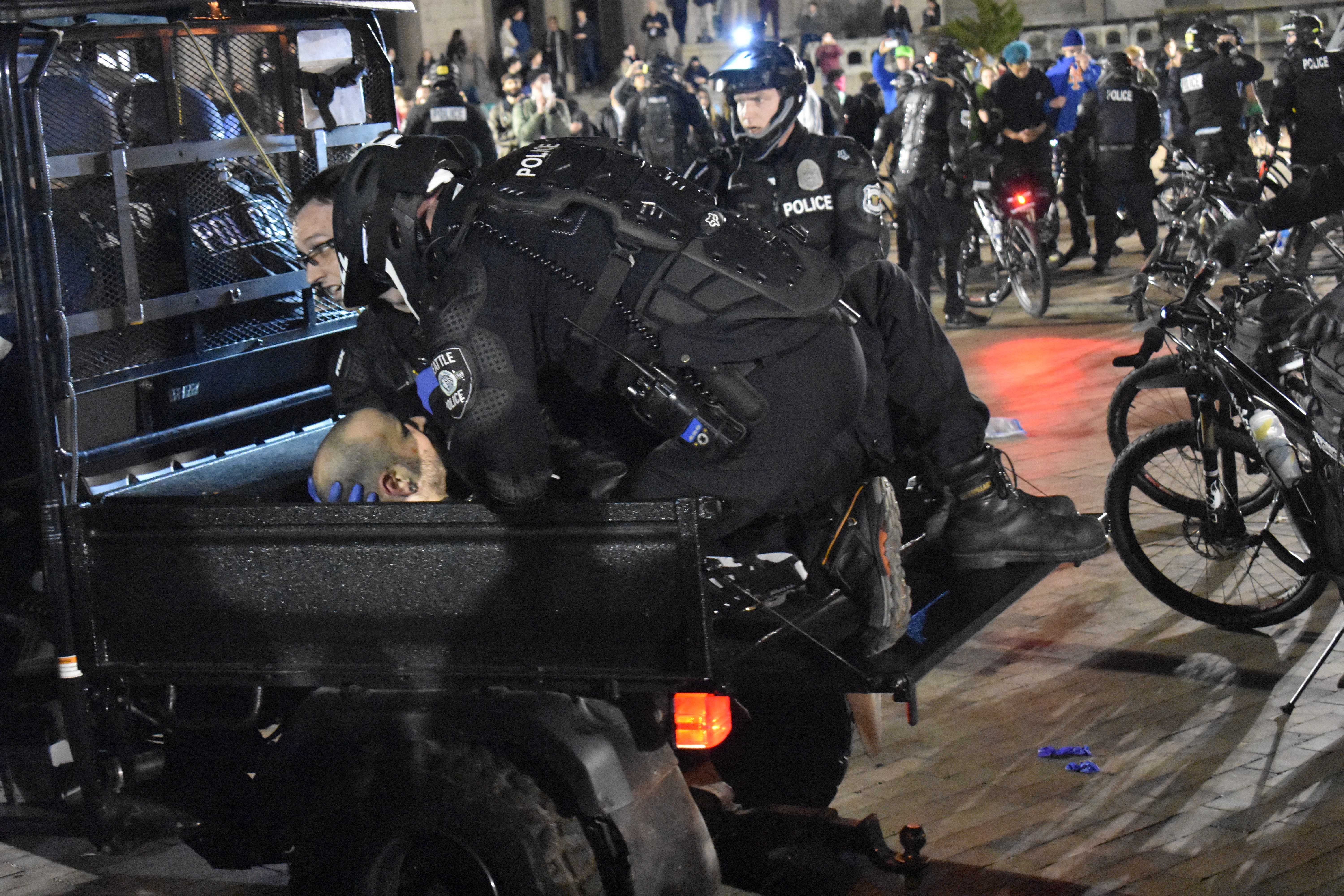 The 34-year-old was shot during a protest of a Milo Yiannopoulos event at Kane Hall on the UW campus. He sustained a wound to the abdomen and was taken to Harborview Medical Center in critical condition on Friday. His condition was upgraded to serious on Sunday morning.