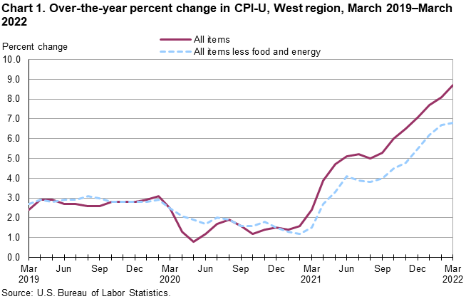 According to the latest report from the Bureau of Labor Statistics, the West Region recorded its largest-ever spike in inflation between March 2021 and March 2022, as the average price for consumer goods outpaced the national average, growing 8.7 percent. The region covers 13 states, including Washington, Oregon, California and Alaska. Updated figures specific to the Seattle metro will be shared later this month.