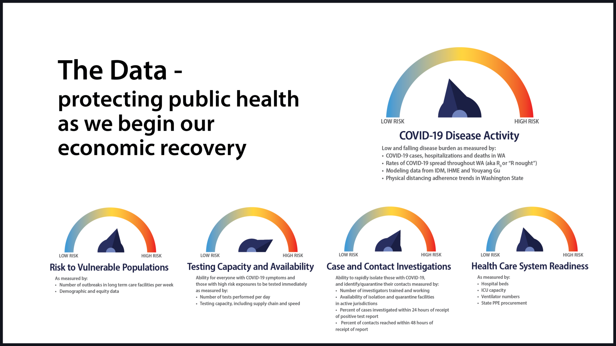 During a news conference at the Capitol Wednesday, the governor shared several data points his office considers when determining when it is appropriate to relax certain measures. The state also launched a new dashboard, allowing the public to track progress in each category via Washington's coronavirus website.