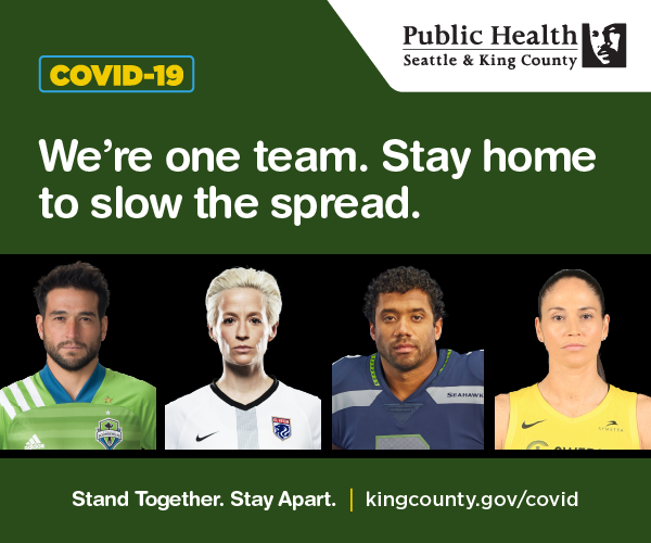 Russell Wilson, Sue Bird, Nicolás Lodeiro and Megan Rapinoe have joined Public Health's COVID-19 public education campaign to encourage King County residents to “Stand Together. Stay Apart."