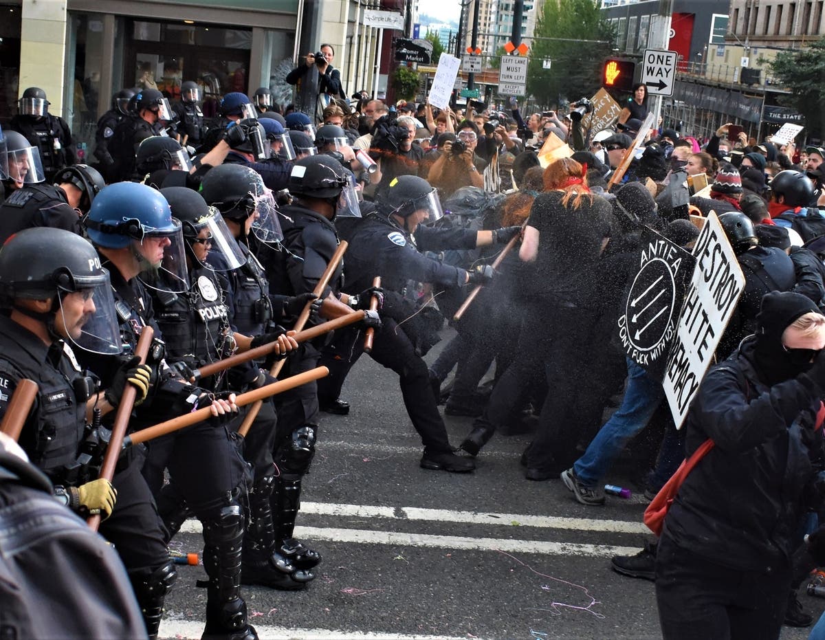 SEATTLE, WA - A pro-Trump group successfully held a rally in downtown Seattle Sunday afternoon. But in the streets around the group's event, counter-protesters fought lines of police in an attempt to confront the pro-Trump group.