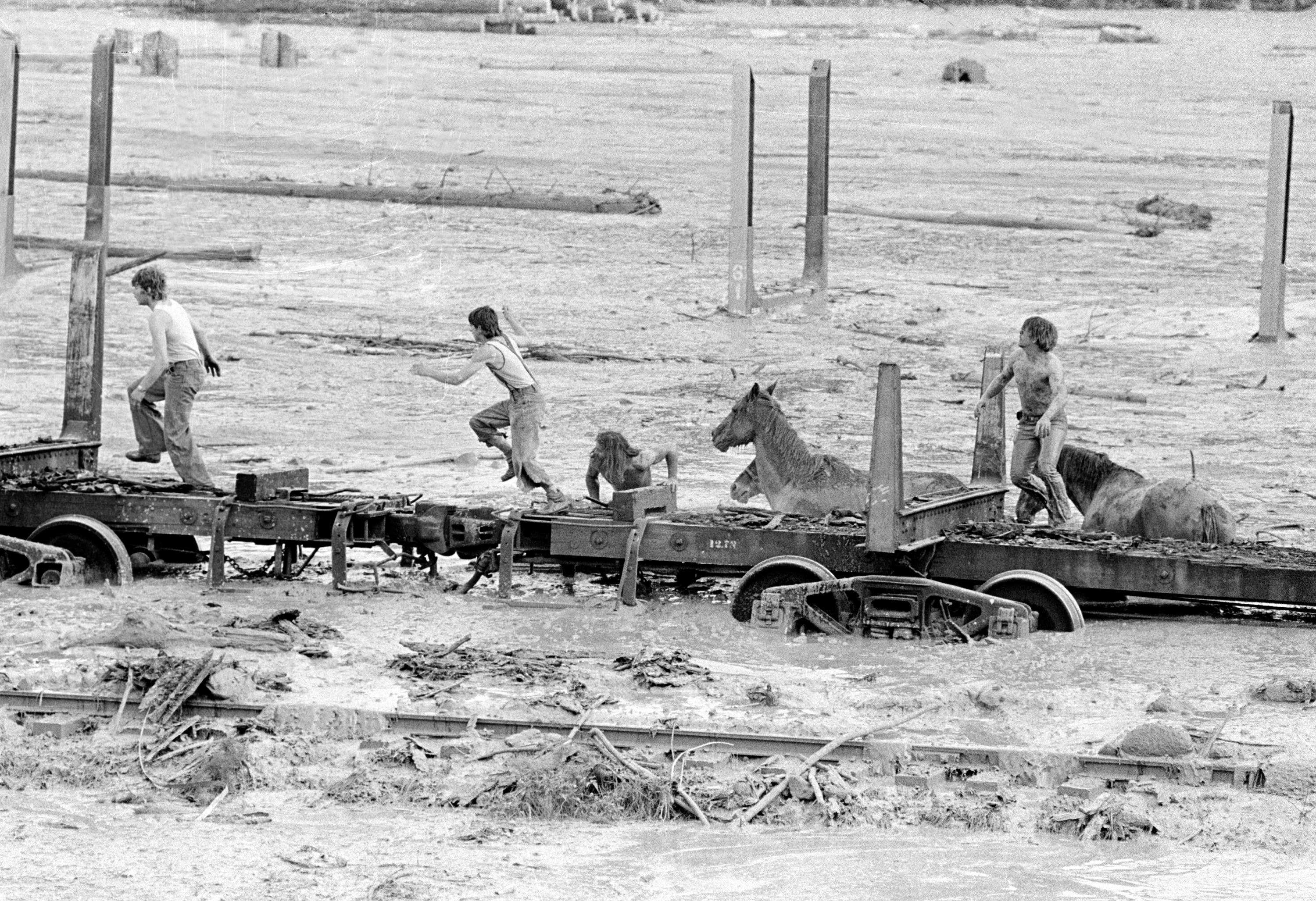 Bob Brown, right and John Brown, are shown May 19, 1980 climbing onto railroad car, center, heads down the train along with two additional would be horse rescuers, giving up their efforts as they flee for their lives as flood waters from the Toutle River begin a sudden rise. All four people reached safety but the horses are presumed to have drowned. (AP Photo/Gary Stewart)