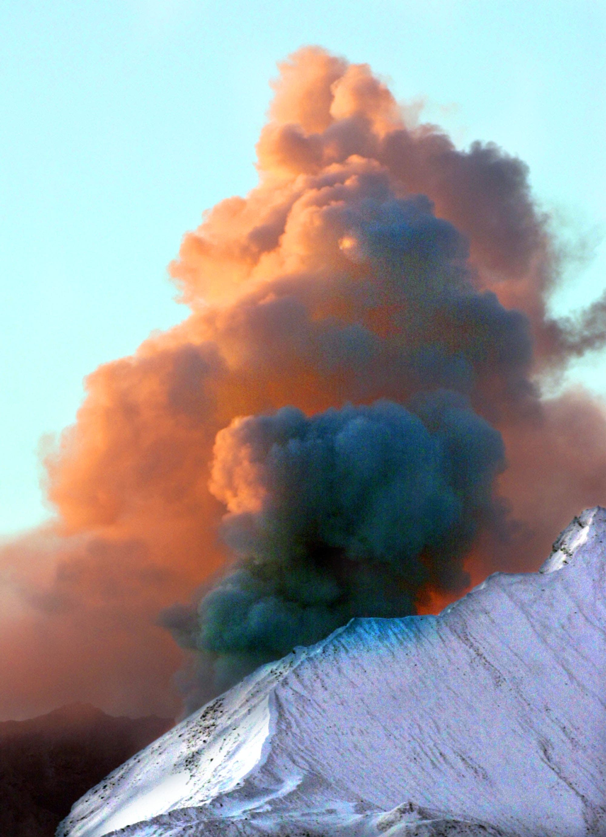 A new steam and ash eruption from Mount St. Helens, captures the colors of early morning sunlight as seen from Castle Lake Viewpoint in southwest Washington Sunday, Oct. 10, 2004. The volcano is sporting a new coat of snow after several days of blustery, wintery weather. (AP Photo/Don Ryan)