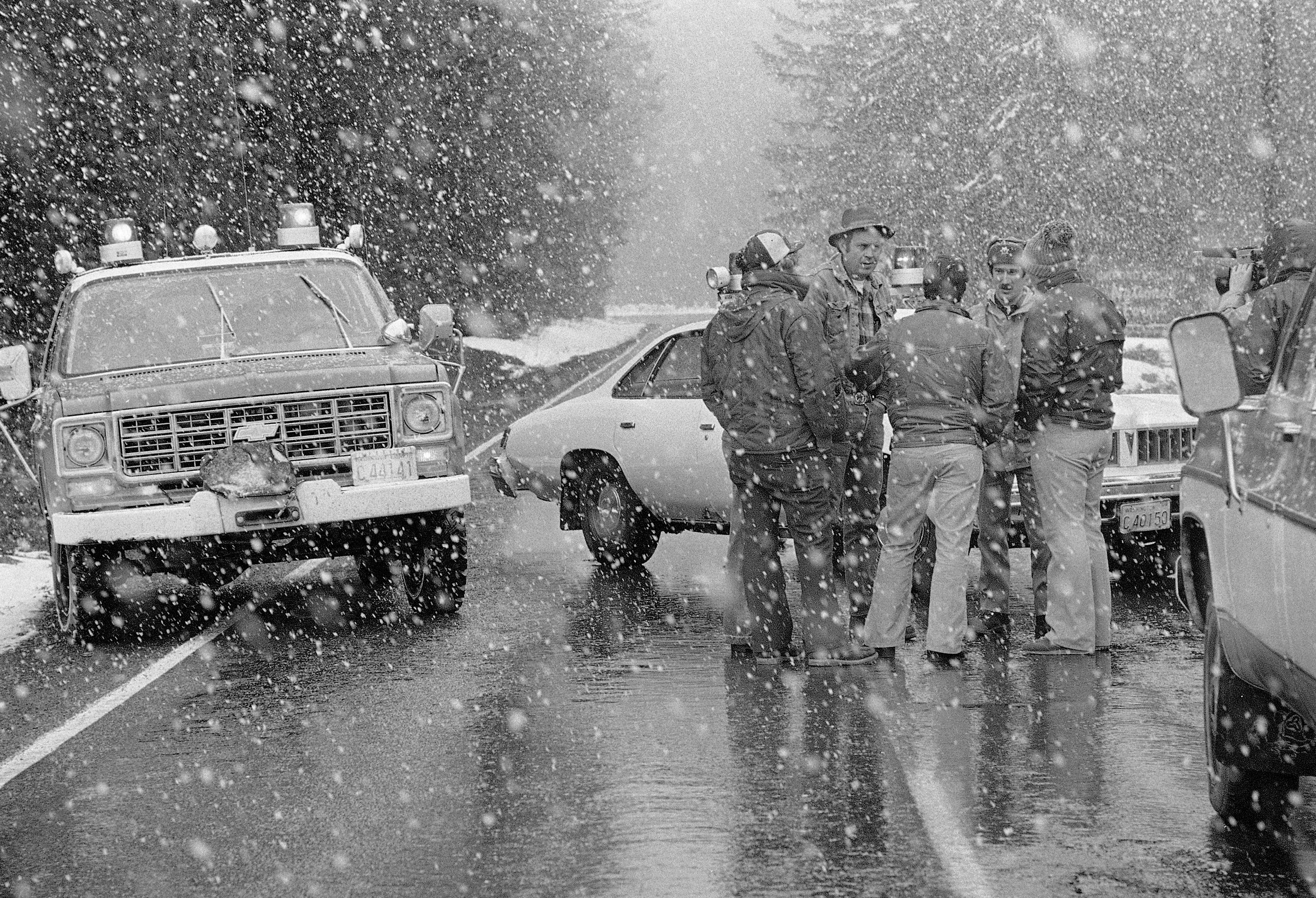 George Barker, of the Skamania County Sheriff Dept., tells residents of homes at Spirit Lake that the road was closed due to earthquakes on nearby Mount St. Helens, March 26, 1980. The mountain has been sealed off in case it does erupt as tremors up to four on the Richter scale have been occurring in past days. (AP Photo/Barry Sweet)