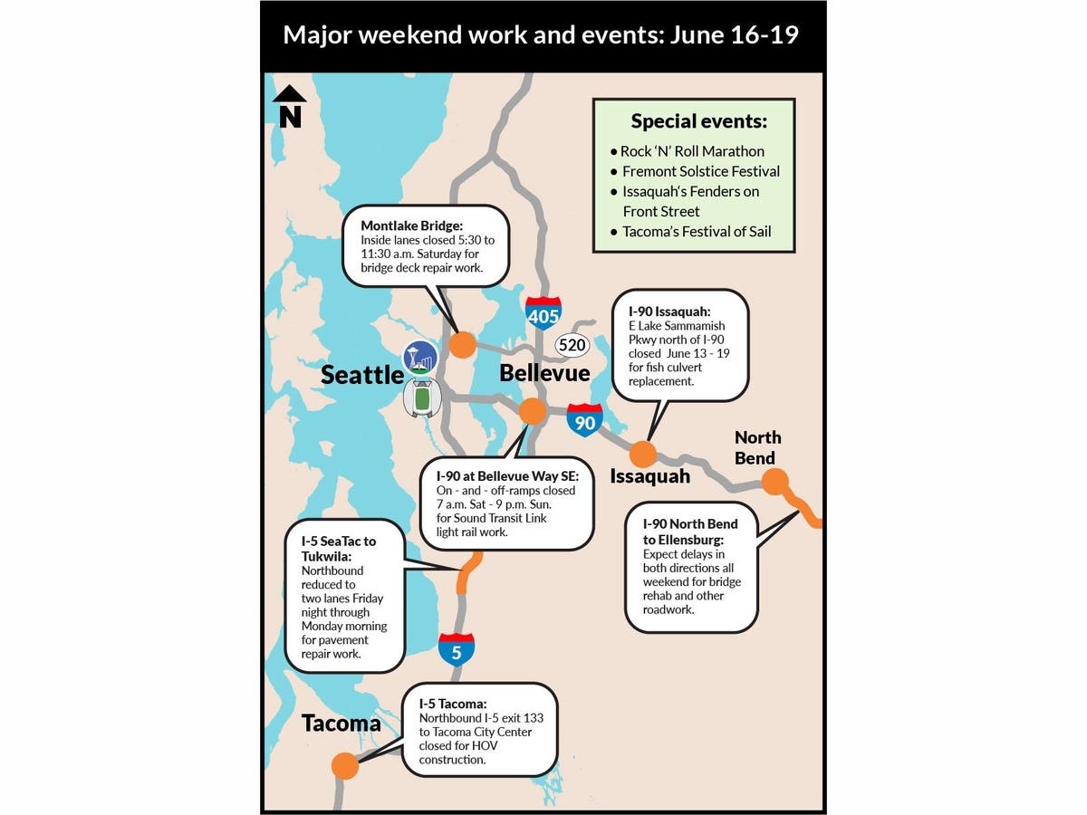 From north to south, construction and special events might make this weekend especially tough for driving around Puget Sound.