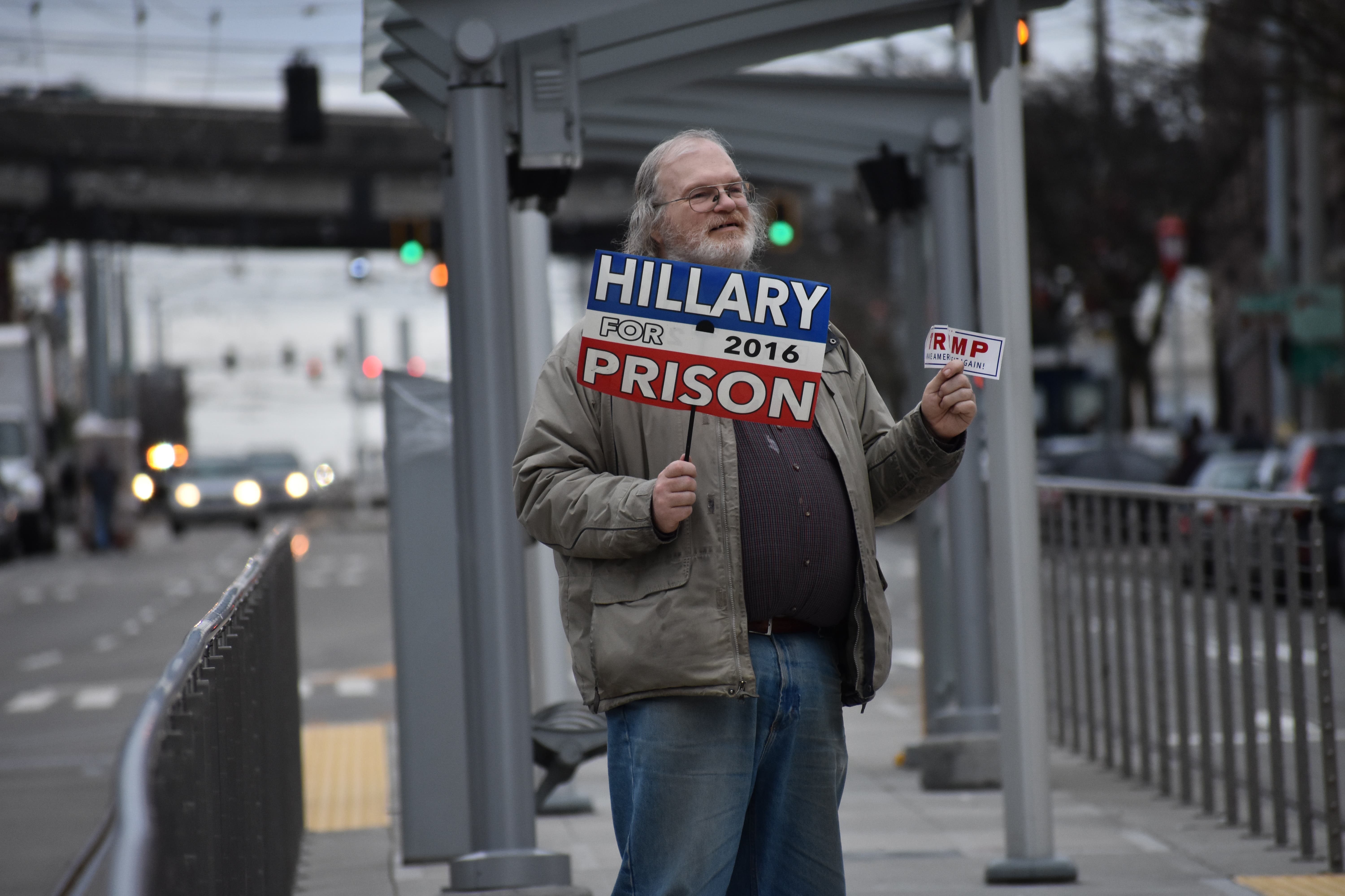 Standing at the Seattle Streetcar stop near 5th Avenue and Jackson Street, he was holding a sign that read "Hillary for Prison." Knight was preparing to confront the hundreds of protesters who were heading in his direction. He likes Trump, and he wants people to give him a chance.