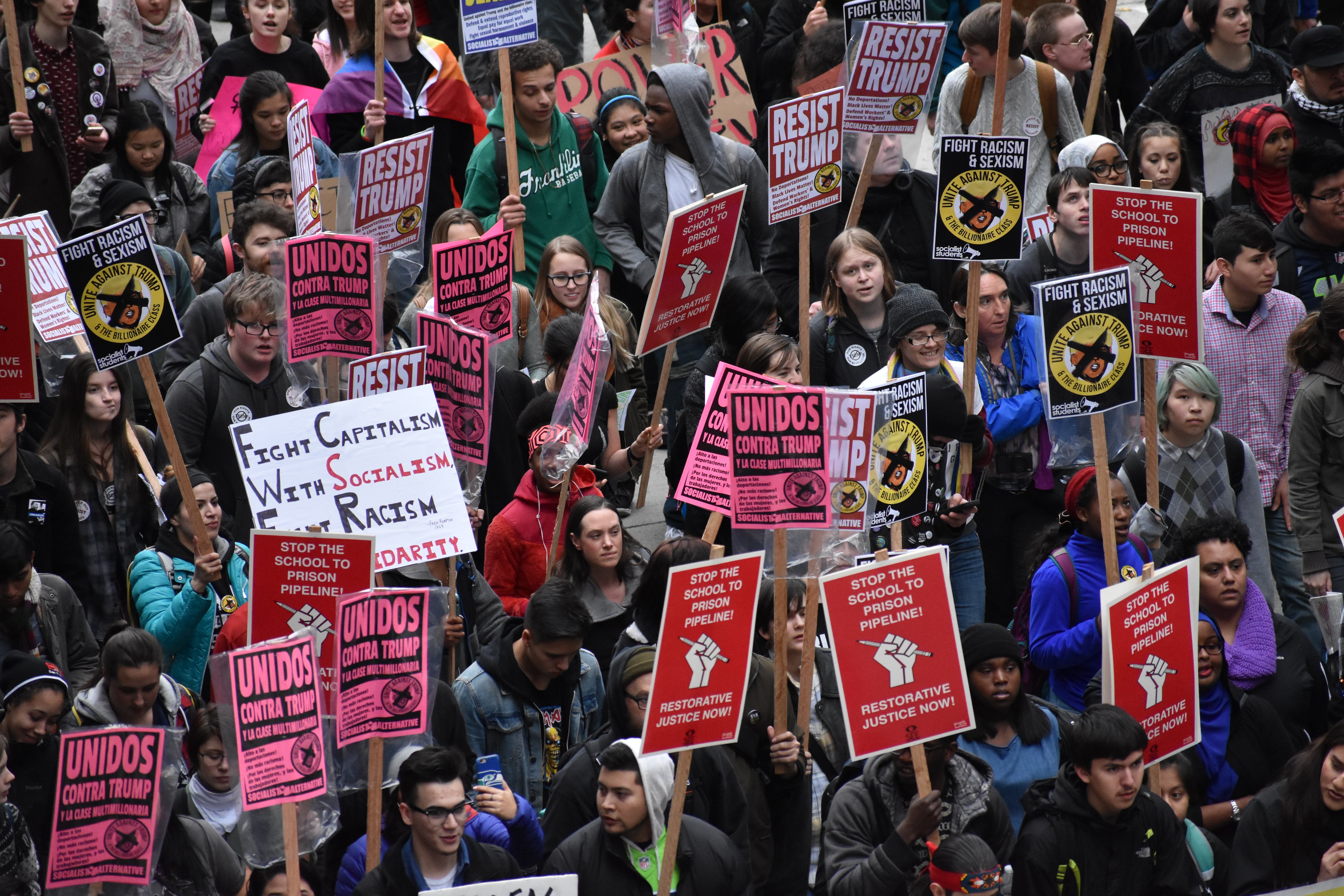 The protest march was comprised of two groups. Around noon on Friday, students and locals gathered at Seattle Central Community College for a general protest of Trump. That group converged with a group advocating immigrants' rights that left from Judkins Park in the Central District.