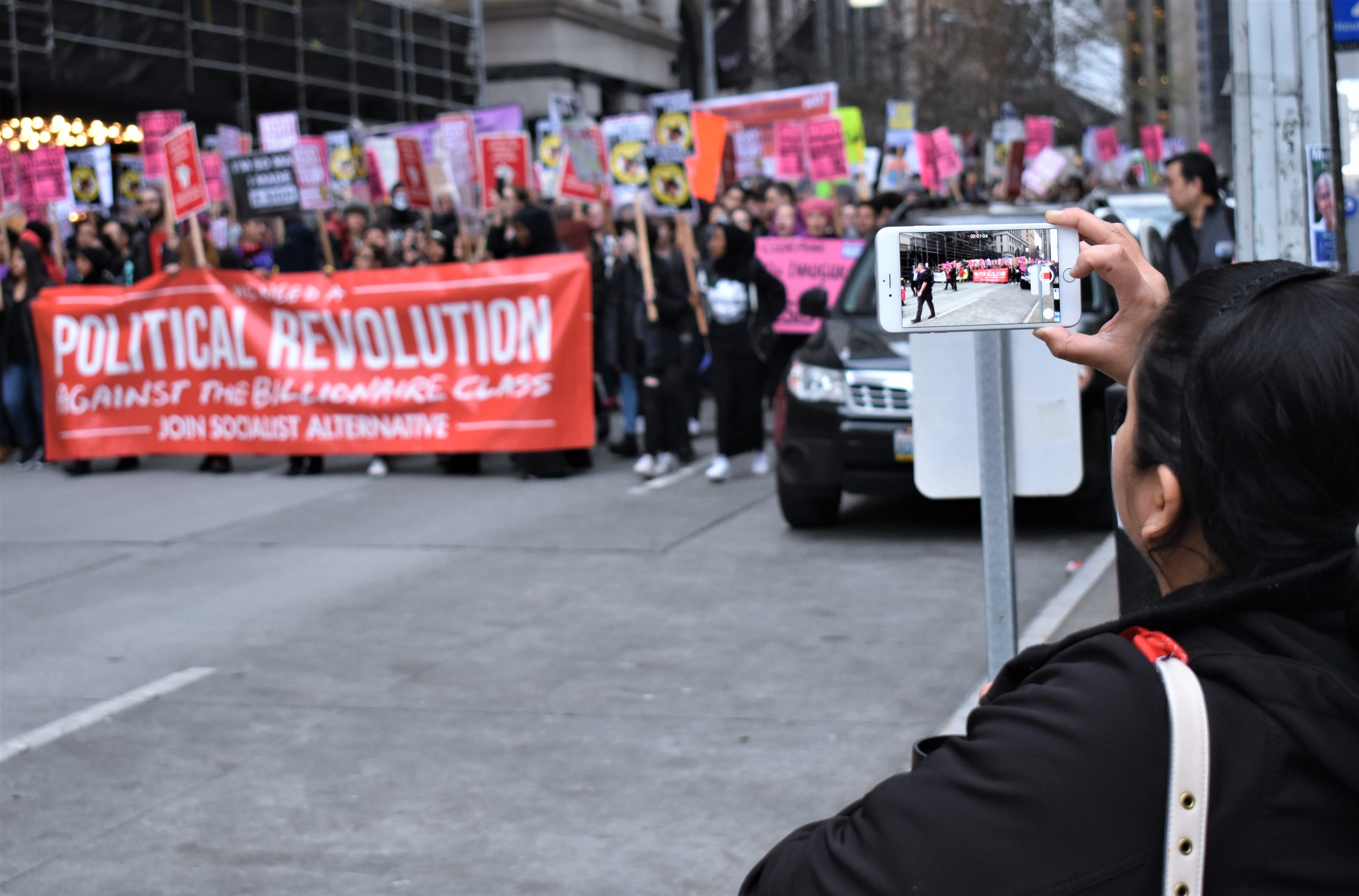 The protest blocked traffic as it moved through downtown, and workers and tourists downtown stopped to stare or take photos - some even joined in. Onlookers seemed more curious than annoyed, although a few pro-Trump slogans could be heard in the vicinity of the protest.