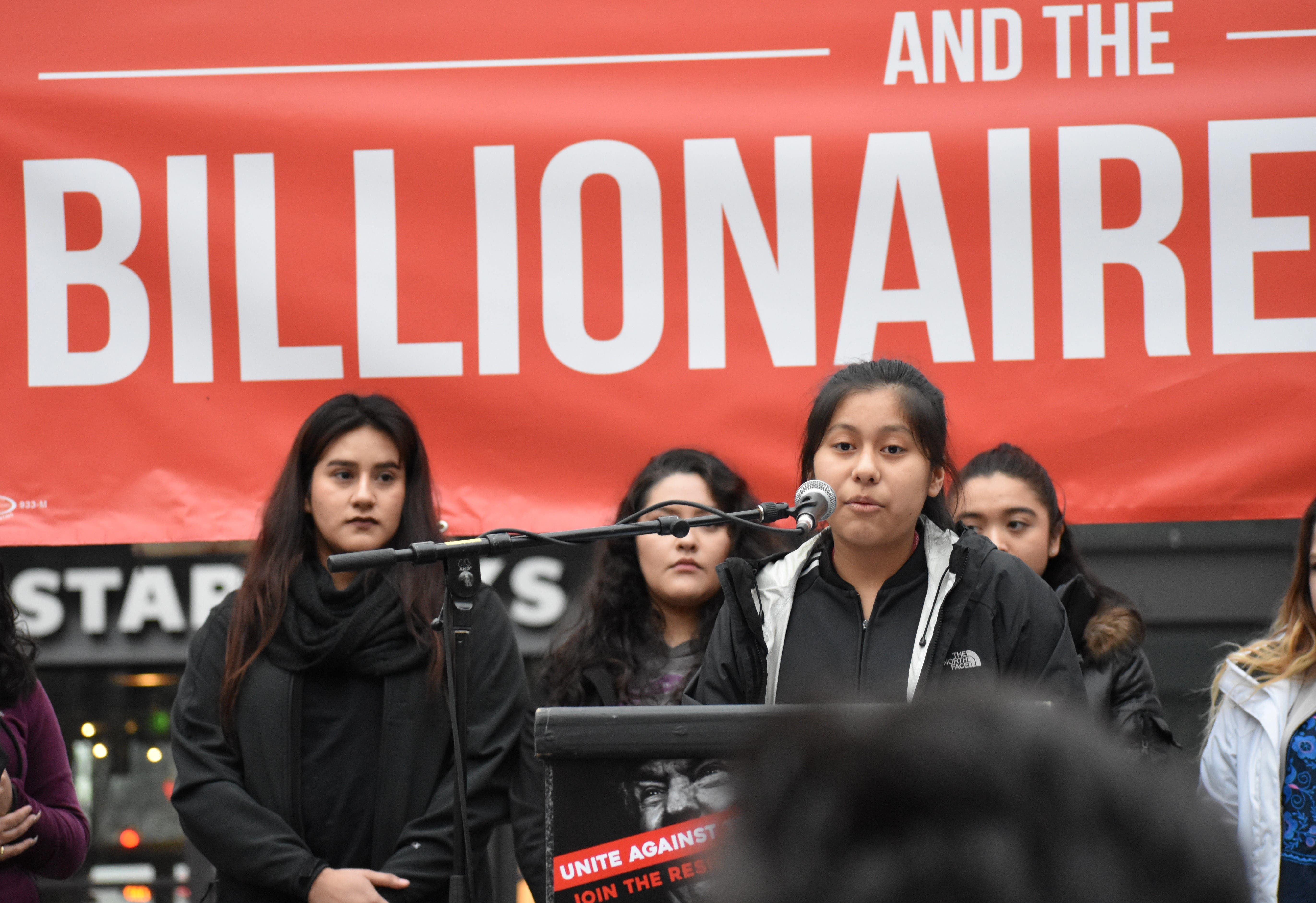 The rally ended with a series of speeches in the middle of Westlake Park. Alma Morales, a student at Foster High School in Tukwila, spoke about her experience with Immigration and Customs Enforcement (ICE). She said ICE agents raided her home and detained her mother. She doesn't want other children to have to experience that, she said.