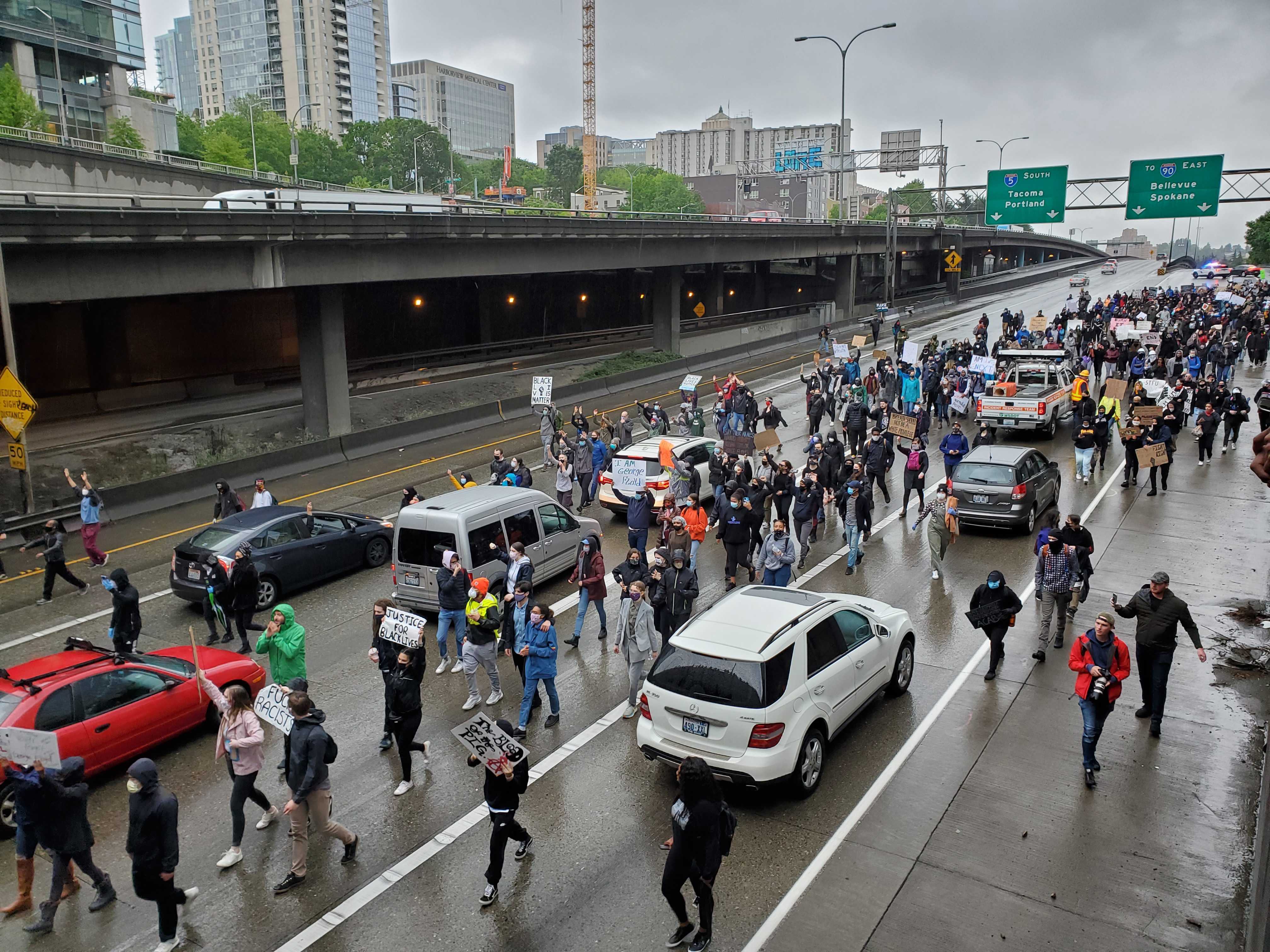 From there, demonstrators stormed the highway, blocking all southbound lanes of I-5 starting near Seneca Street, according to police, who ordered crowds to disperse.
