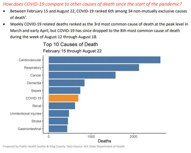SEATTLE, WA — While the number of deaths resulting from COVID-19 illnesses has dropped substantially since the first peak of the outbreak in April, the disease still ranks as the sixth leading cause of all deaths in King County this year, according to a new public health report. In March and early April, the illness ranked third. In recent weeks, it has dropped to eighth.