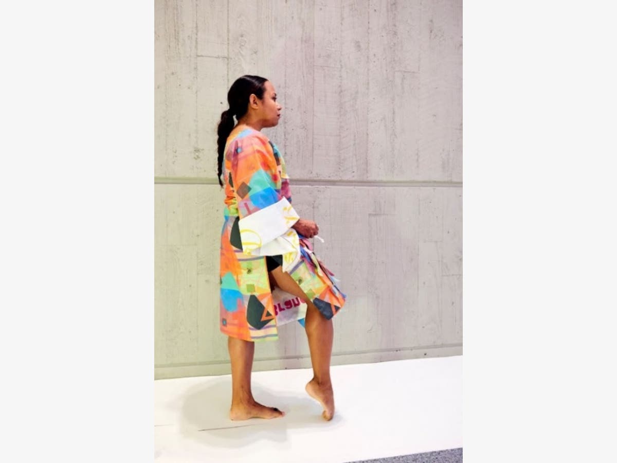 Jono Vaughan’s ongoing series Project 42 is named for the short life expectancy of transgender individuals in the United States. The project, begun in 2012, aims to raise awareness of a persistent pattern of extreme violence against trans people by commemorating 42 murdered individuals. For each work in the series, the artist designs a garment that begins with an image of a murder location, which is then digitally manipulated to create an abstract textile print. The garment is then worn by a collaborator in performance, as a form of memorialization and celebration of the victim. Vaughan hopes this accessible approach will provide an opportunity for engagement and discussion.
