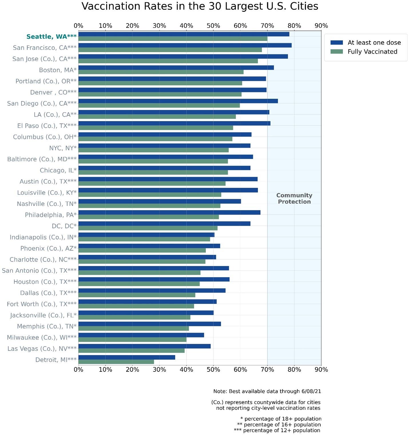 SEATTLE — Seattle is the first major city in the United States to reach the 70 percent mark for fully vaccinated residents ages 12 and older, the mayor's office announced Wednesday. Mayor Jenny Durkan said the Emerald City has successfully overtaken San Francisco for the top spot and even pulled ahead of Vermont, which leads the nation in statewide vaccination rates.