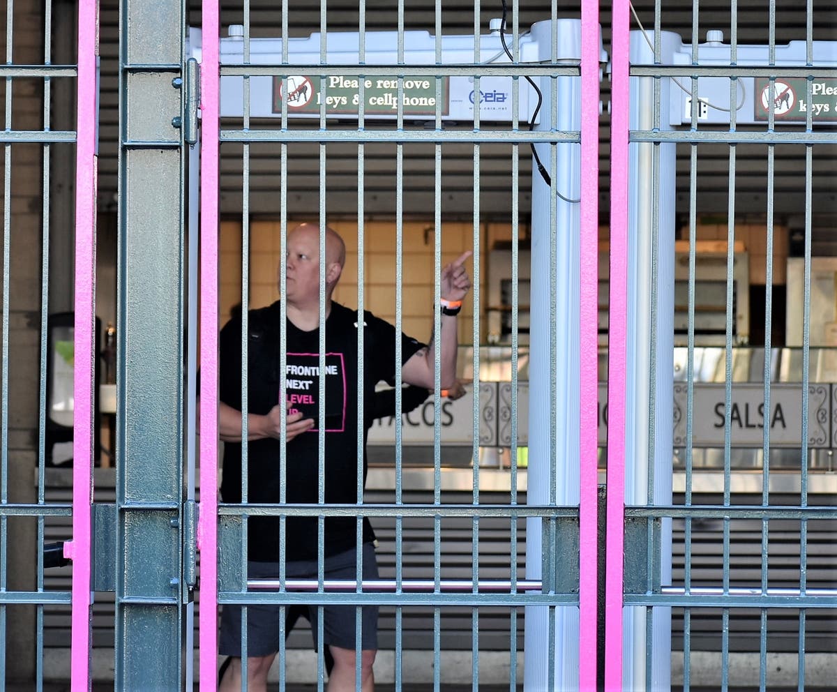 We'll start at the entrance. T-Mobile has highlighted the express entry gates along Royal Brougham Way in the company's iconic magenta hue.