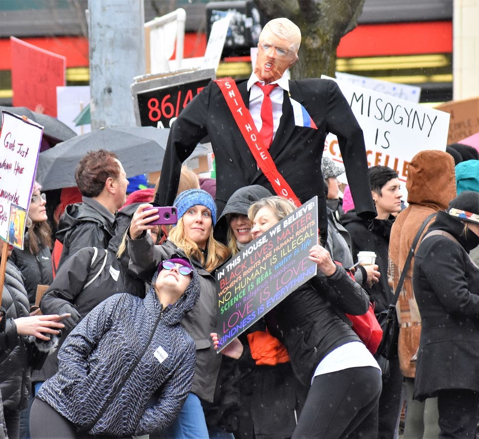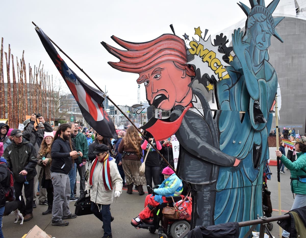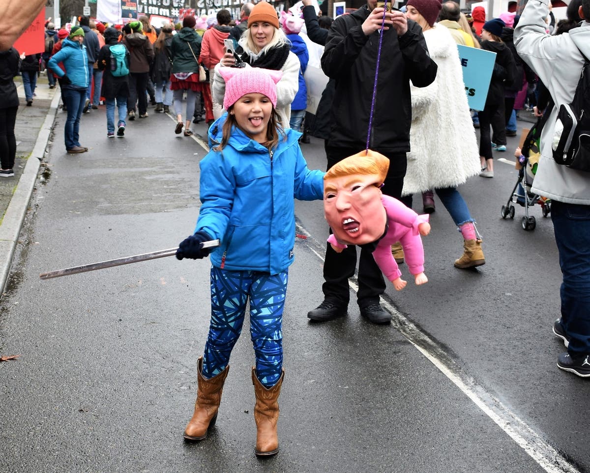 A demonstrator shouts at a man stationed along the march route asking people to "repent." Along the way, marchers had the chance to hit a Trump pinata. Many, including this young girl, took a swing.A piece of anti-Trump art showing the president grabbing the Statue of Liberty and getting smacked for it. The Seattle Women's March 2.0 was smaller than the 2017 event, where about 150,000 came out. But Seattle's rally was one of hundreds across the country in cities from Los Angeles to Tulsa, Oklahoma. Estimates indicate over 1 million people across the country participated in Saturday's events.