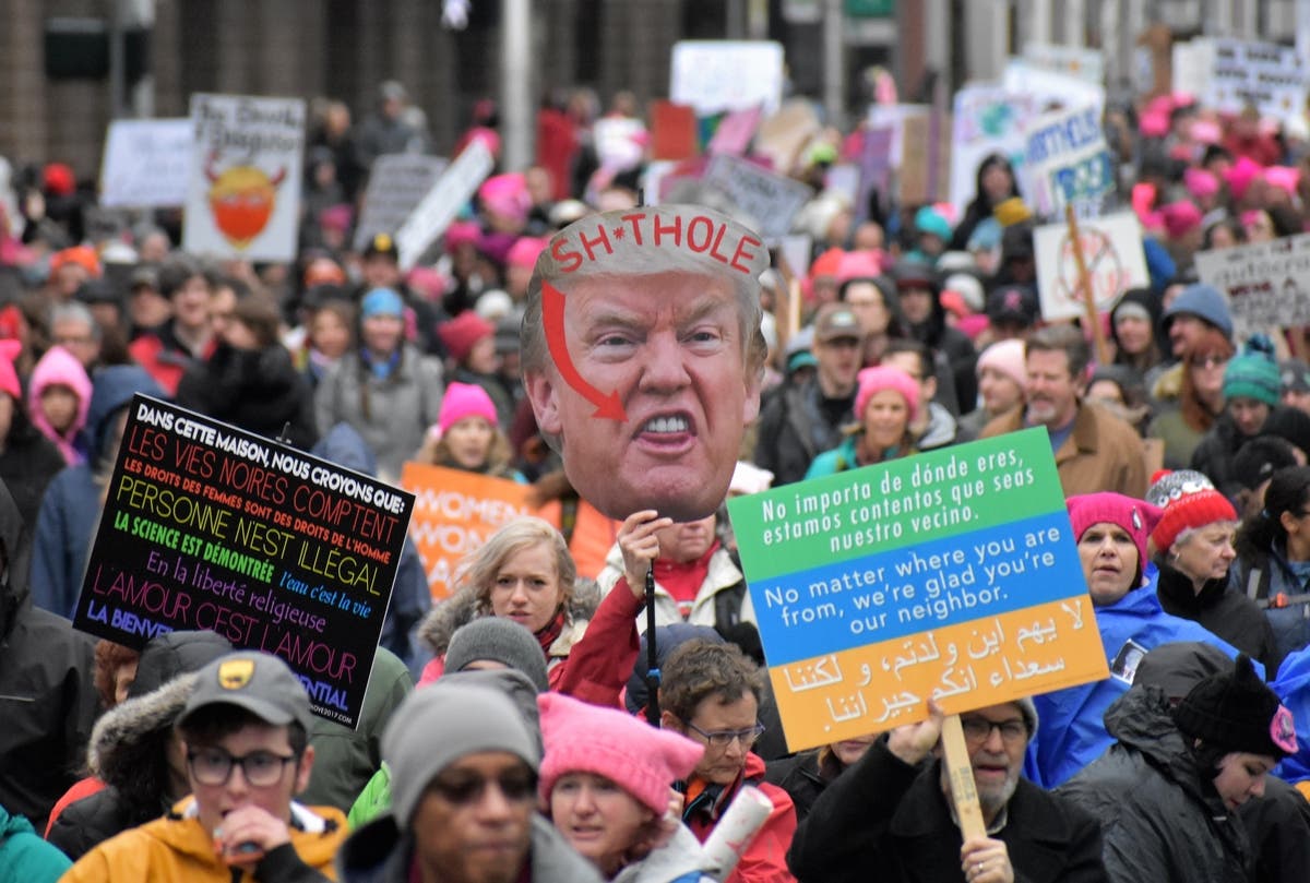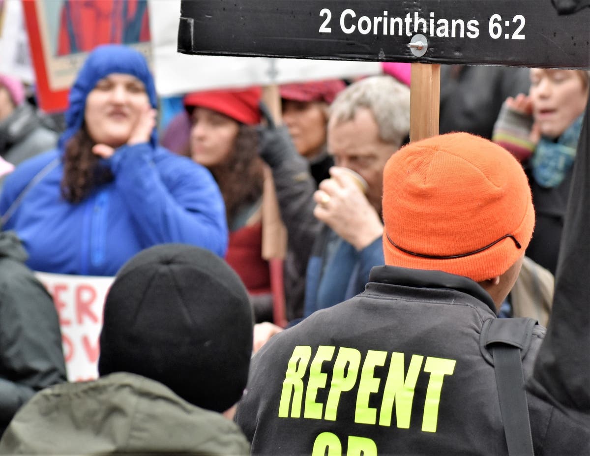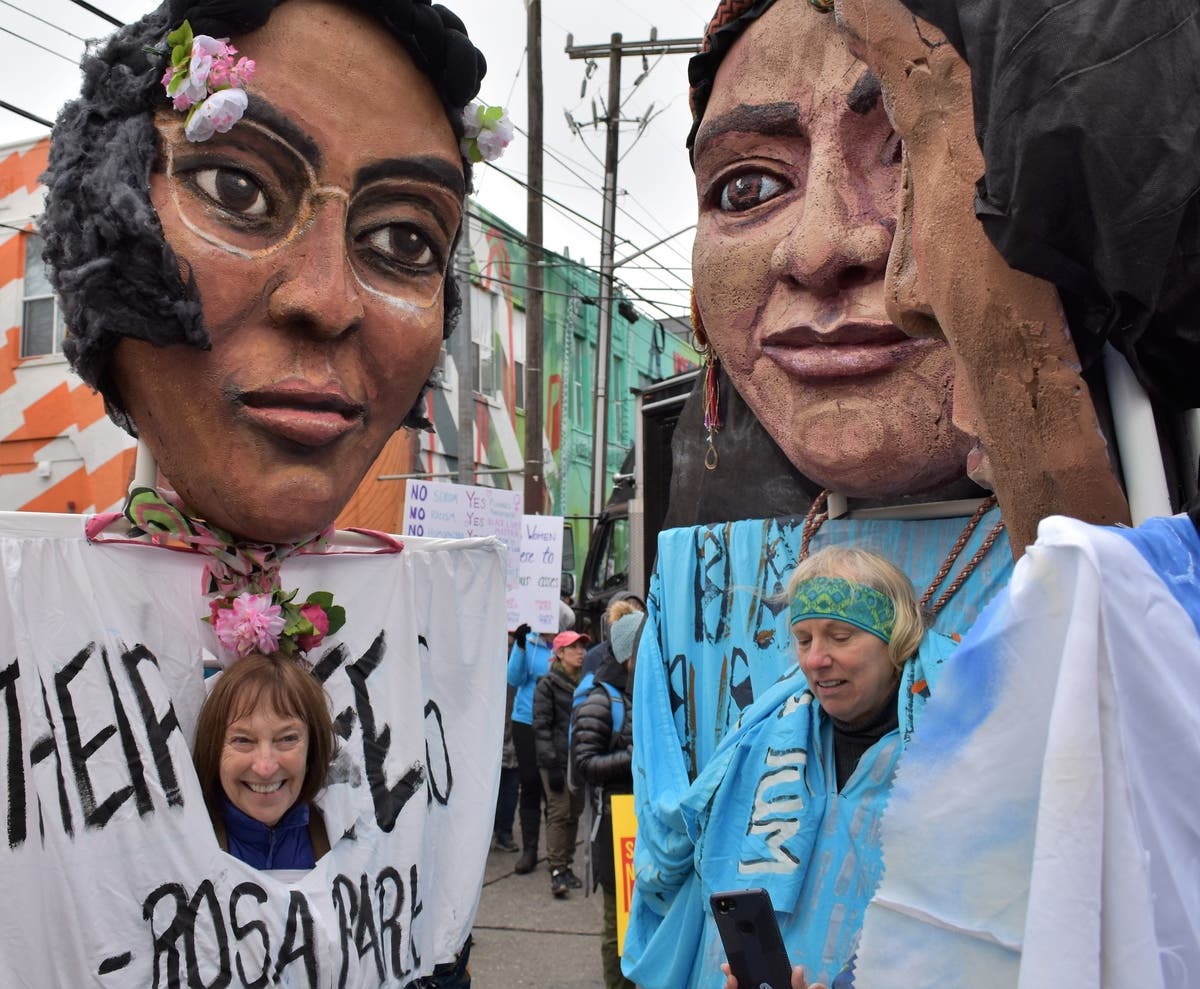A demonstrator shouts at a man stationed along the march route asking people to "repent." Along the way, marchers had the chance to hit a Trump pinata. Many, including this young girl, took a swing.A piece of anti-Trump art showing the president grabbing the Statue of Liberty and getting smacked for it. The Seattle Women's March 2.0 was smaller than the 2017 event, where about 150,000 came out. But Seattle's rally was one of hundreds across the country in cities from Los Angeles to Tulsa, Oklahoma. Estimates indicate over 1 million people across the country participated in Saturday's events.