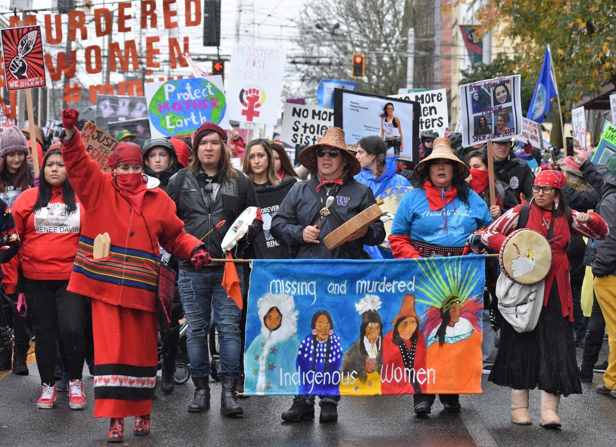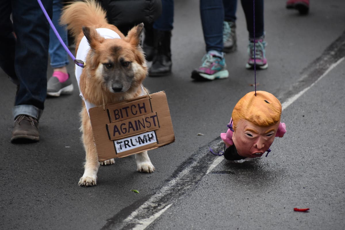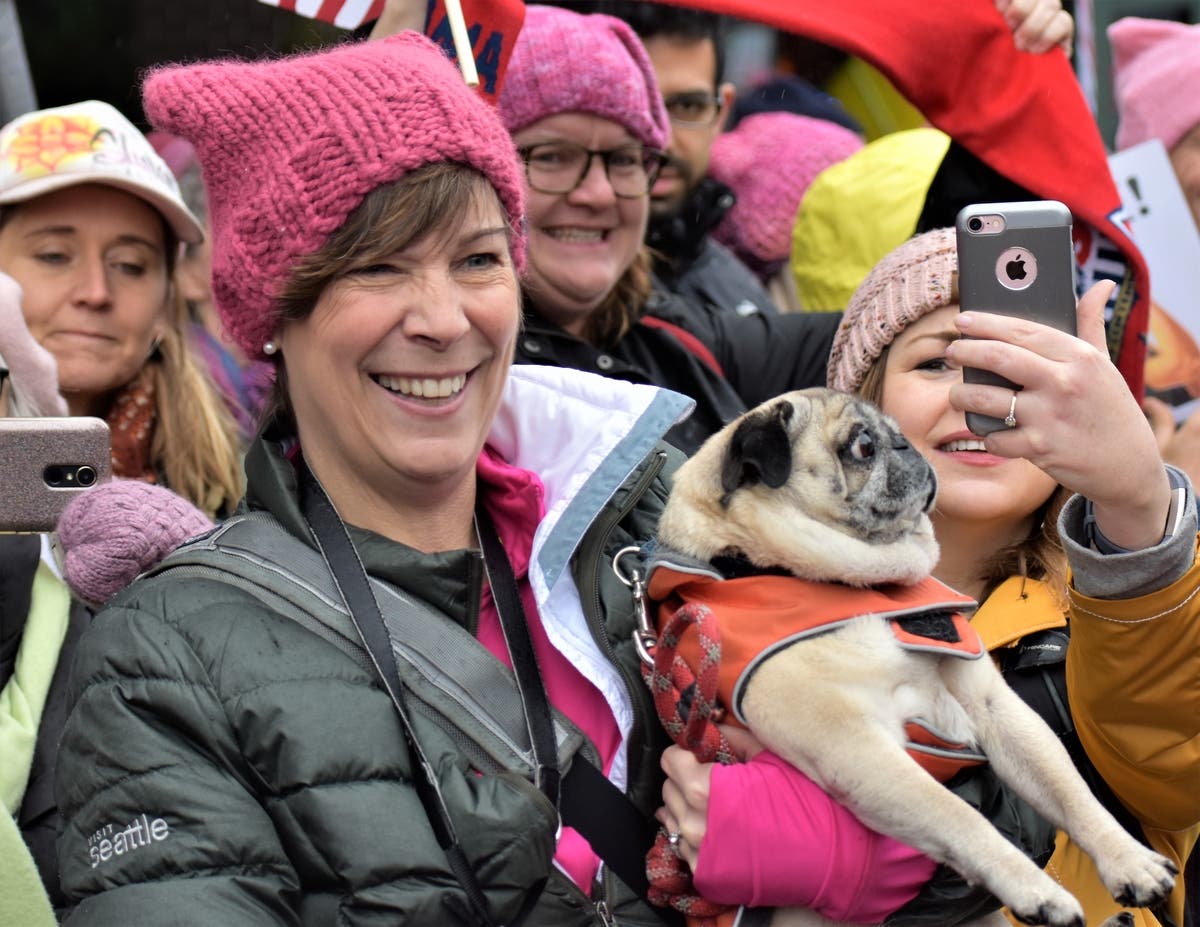 Linda White (l) and Lorie Winnemuller (r) marched as icons of the women's rights movement. The march began around 10 a.m. at Cal Anderson Park with speeches from indigenous rights groups, Seattle Mayor Jenny Durkan, and Seattle Councilwoman Teresa Mosqueda. Alan Pucket was among a group of right-wing demonstrators. Pucket, who was wearing a sticker on his shirt that read "Got AIDS yet?", was being protected by Seattle police after women's march protesters confronted him. Activists with the group Missing and Murdered Indigenous Women group led the Seattle Women's march. Dogs of all sizes and shapes accompanied their owners in the march. Some dogs were even wearing pink pussy hats. A lone Donald Trump supporter watches the parade. Trump on Saturday tweeted that the weather was perfect for women to celebrate his administration's "milestones."As marchers from Cal Anderson reached downtown, they were joined by thousands of others who had gathered near Westlake Park.One of the many PG-13 rated signs at Saturday's Women's March in Seattle.