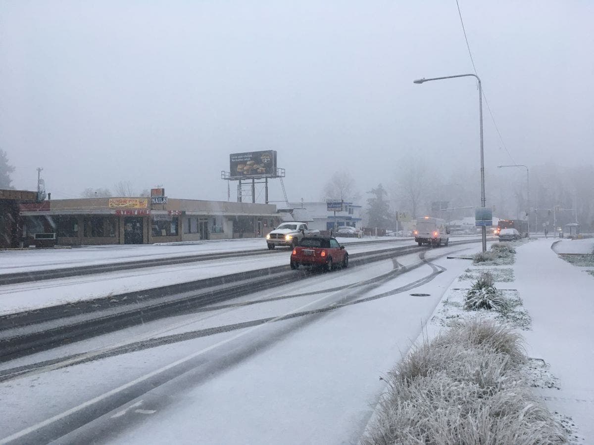 Near 2:30 p.m., weather spotters in Chehalis measured 1 inch of snow in that city. The Washington State Patrol was reporting fast-moving snow at the Lewis/Thurston County line.