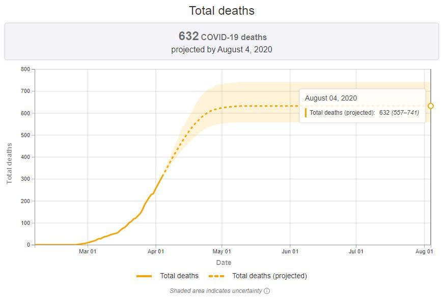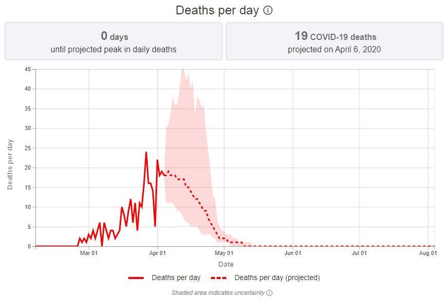 Nationally, the institute's projections remain largely on-track with earlier models, but its highest estimates are lower. The updated model forecasts 81,766 COVID-19 deaths in the U.S., ranging between 49,431 and 136,401, and peaking April 16, with more than 3,100 deaths in a single day.