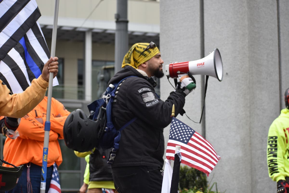 Caption: Patriot Prayer leader Joey Gibson speaks at Westlake Park in Seattle on May Day 2017.
