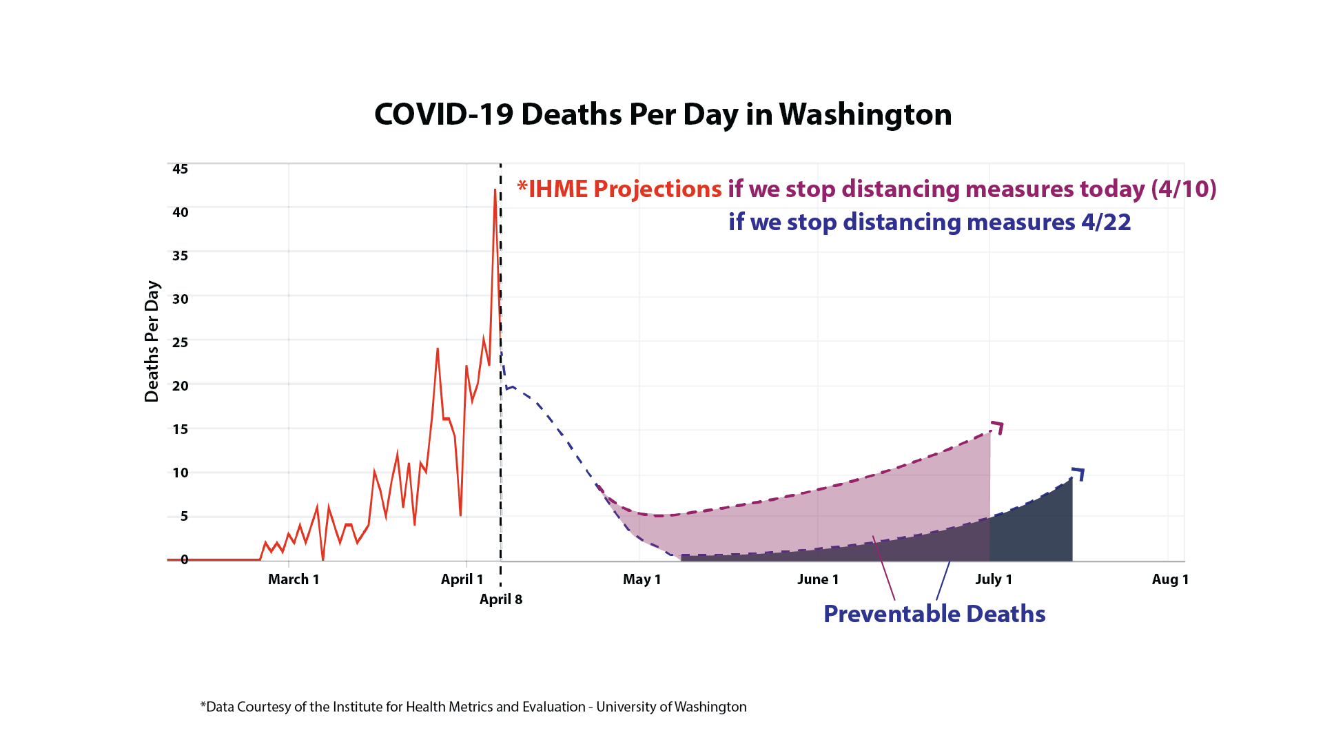 Another illustration shows the potential consequences if the state lets up on its efforts too soon. The updated modeling shows preventable deaths related to the virus rebounding quickly, should social distancing measure today, or even two weeks from now.