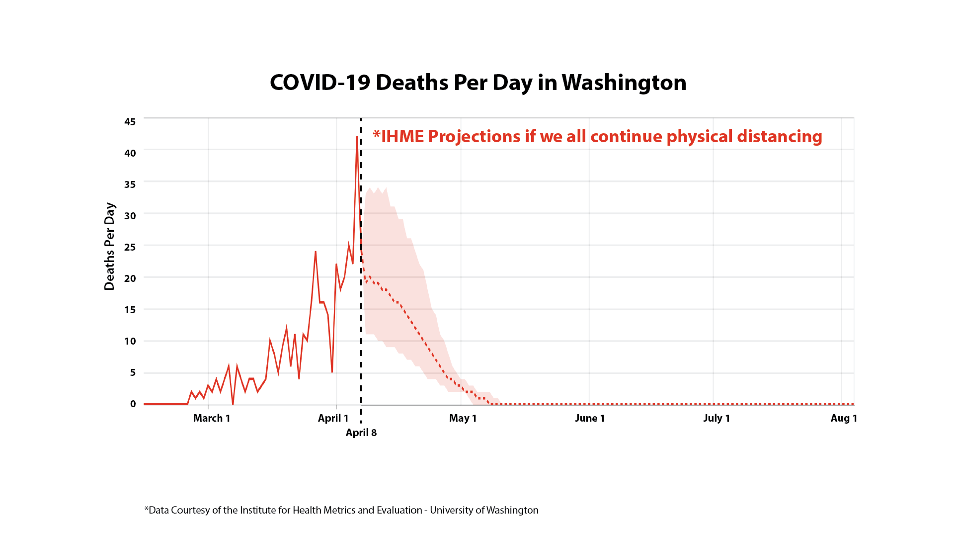Current modeling shows the first wave of the epidemic should end by early June, with no new deaths reported by July and August. For that projection to become reality, researchers say widespread social distancing efforts must remain in place until at least the end of May.
