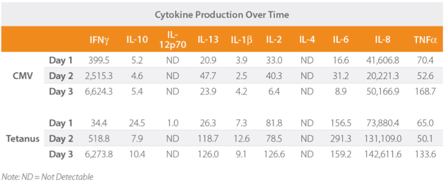 Keep in mind the cytokine fundamentals when analyzing your charts. For example, IL-2 may not be detectable in your readout, but remember that IL-2 is usually consumed as quickly as it is produced, so this shouldn't be surprising.