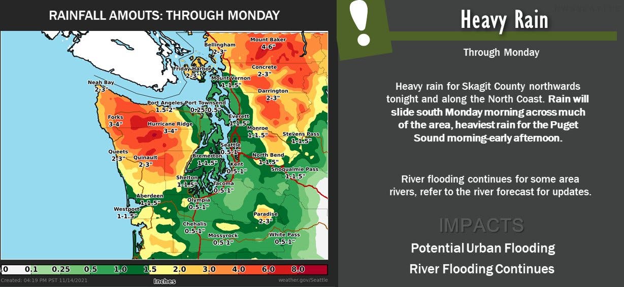 "For most areas, the most impactful (outside of Skagit/Whatcom/North Coast) will be during the day on Monday," NWS Seattle wrote Sunday. "Heaviest rain expected to move through between 9 a.m. - 3 p.m. for most of the interior. Urban flooding will be possible for low-lying areas with poor drainage during this, with rates of 0.25 - 0.50" possible."