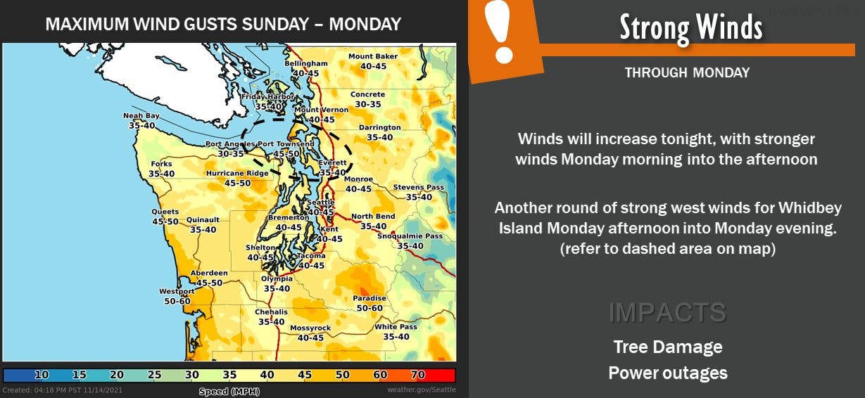 Forecasters expect Monday will be a little gustier than initially thought, and a wind advisory will remain in effect until 4 p.m. Strong winds will be possible across Western Washington, bringing back an elevated risk for downed trees and power outages around Puget Sound. Gusts could reach 45 mph around Seattle and Tacoma.
