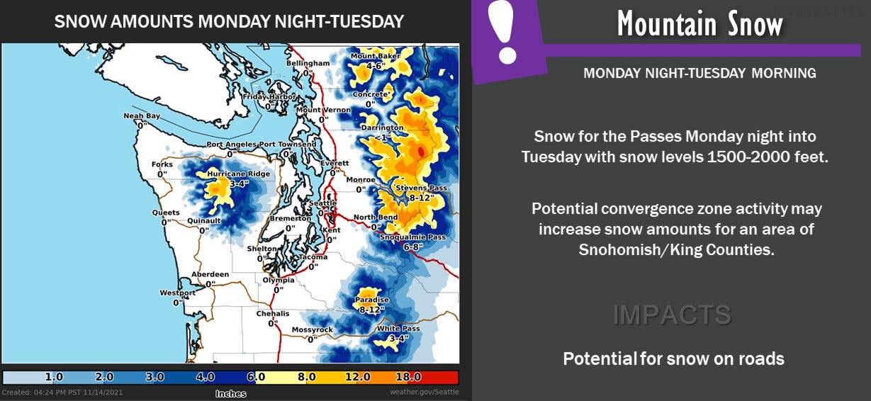 As the atmospheric river moves out of the area, warmer temperatures will go with it. According to the National Weather Service, snow levels will dip below 2,000 feet Monday evening into Tuesday morning, allowing a round of new accumulation at Snoqualmie and Stevens passes. In the lowlands, afternoon temperatures will tumble by ten degrees Tuesday, failing to reach the 40s, and overnight lows could fall to the mid-30s.